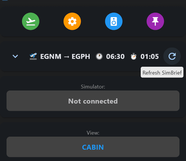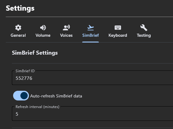 SimCab uses SimBrief for flight initialisation. Please ensure you have a Simbrief account and input your Pilot ID (Found in Account Settings in Simbrief) in the Simbrief Tab found in Settings